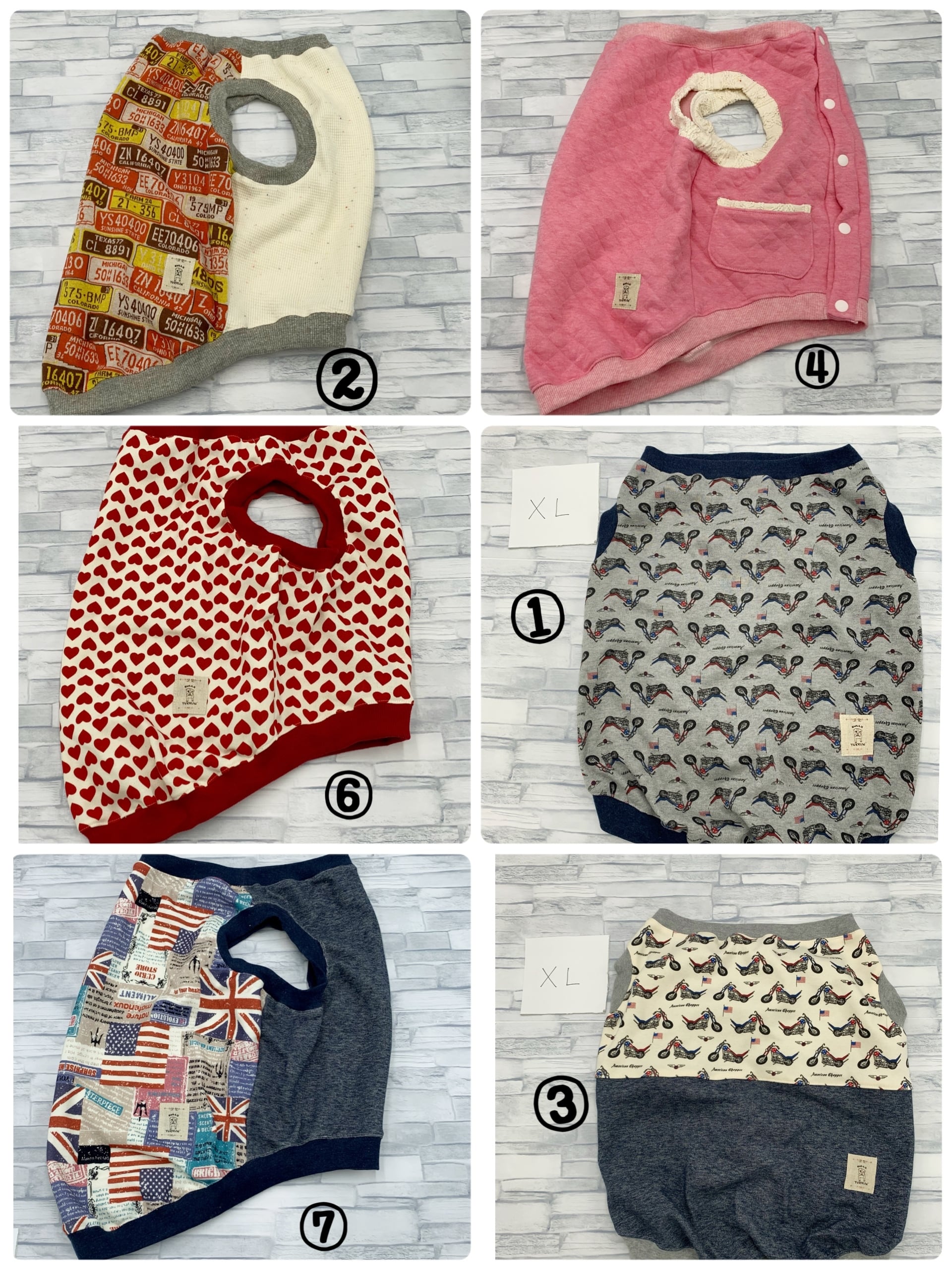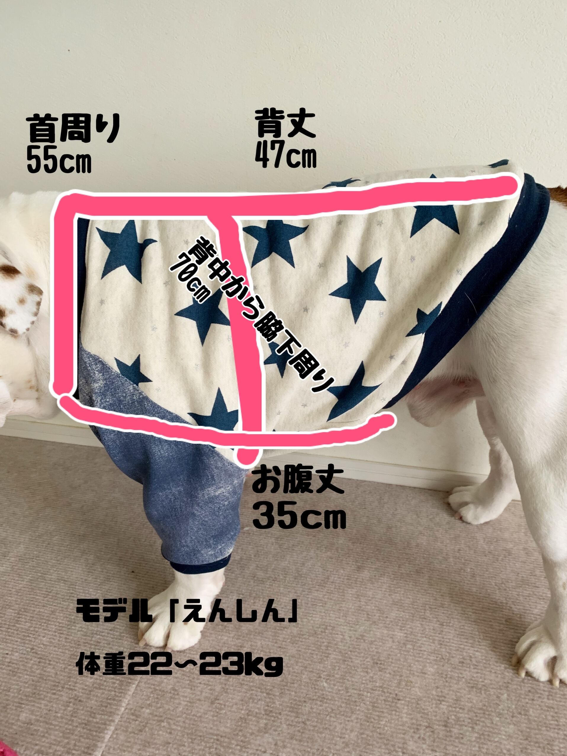 首周りと、裾にゴム穴をつけゴムを通しました。ブルドッグの特殊な体型に合うように調整して着用してください。