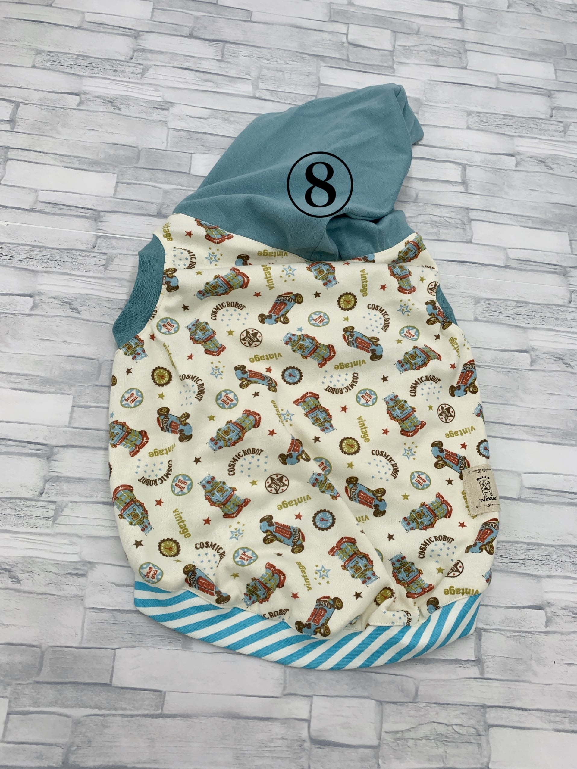 首周りと、裾にゴム穴をつけゴムを通しました。ブルドッグの特殊な体型に合うように調整して着用してください。